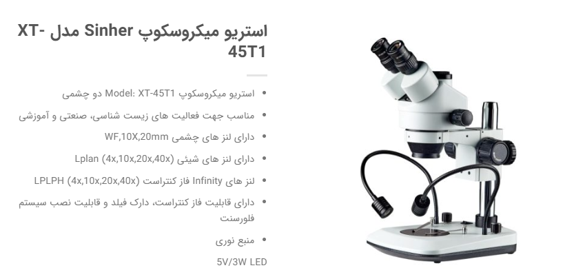 استریو میکروسکوپ مدل XT-45T1 ساخت برند معتبر Sinher، یکی از پیشرفته ترین و کاربردی ترین میکروسکوپ های سه چشمی موجود در بازار تجهیزات آزمایشگاهی است. این مدل به دلیل طراحی مدرن و قابلیت های ویژه خود، به خصوص در حوزه های زیست شناسی، صنایع مختلف و آموزش، توانسته جایگاه ویژه ای کسب کند.
