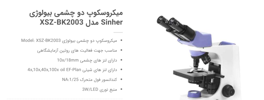 اگر قصد خرید میکروسکوپ دو چشمی بیولوژی با بهترین کیفیت و خدمات پس از فروش را دارید، مدل XSZ-BK2003 از Sinher پاسخگوی تمامی نیازهای شما خواهد بود. جهت سفارش و دریافت اطلاعات بیشتر در مورد قیمت و شرایط خرید با کارشناسان فروش مبناژن تماس بگیرید.