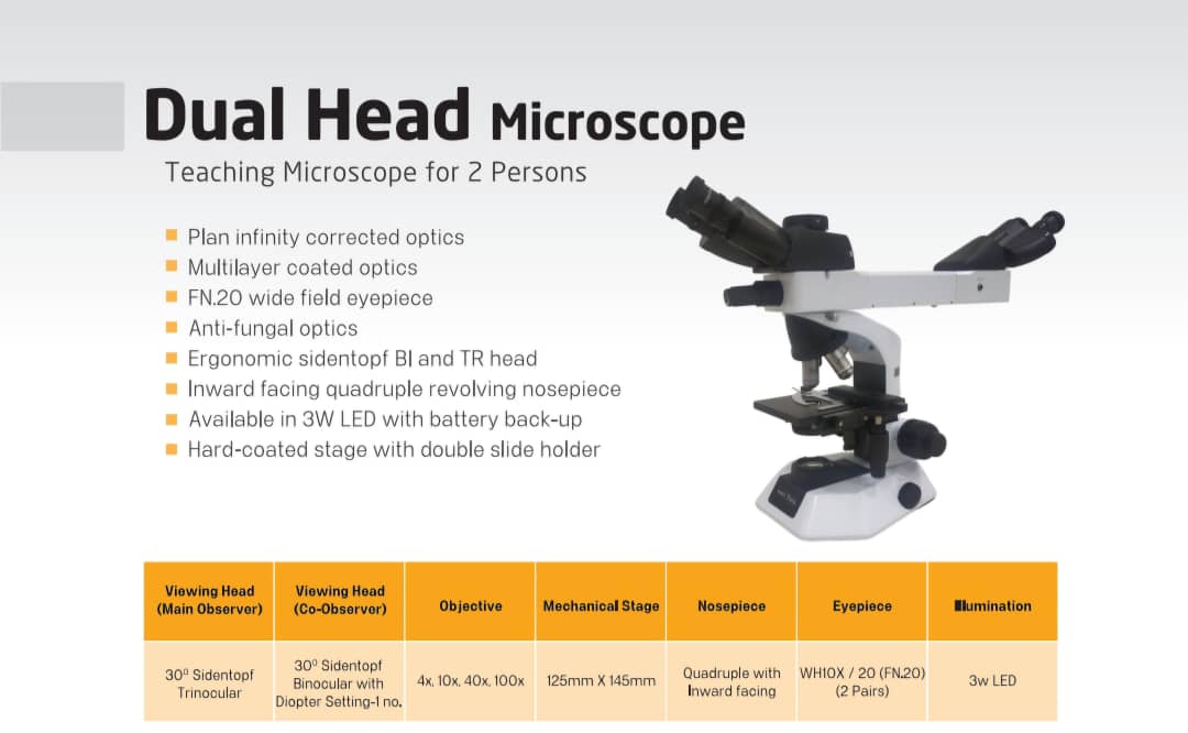 - ویژگی دو سر بودن (Dual Head) این میکروسکوپ باعث میشود مدرس بتواند در لحظه، مشاهدات دانشجو را بررسی کرده و فرآیند یادگیری سرعت بگیرد.