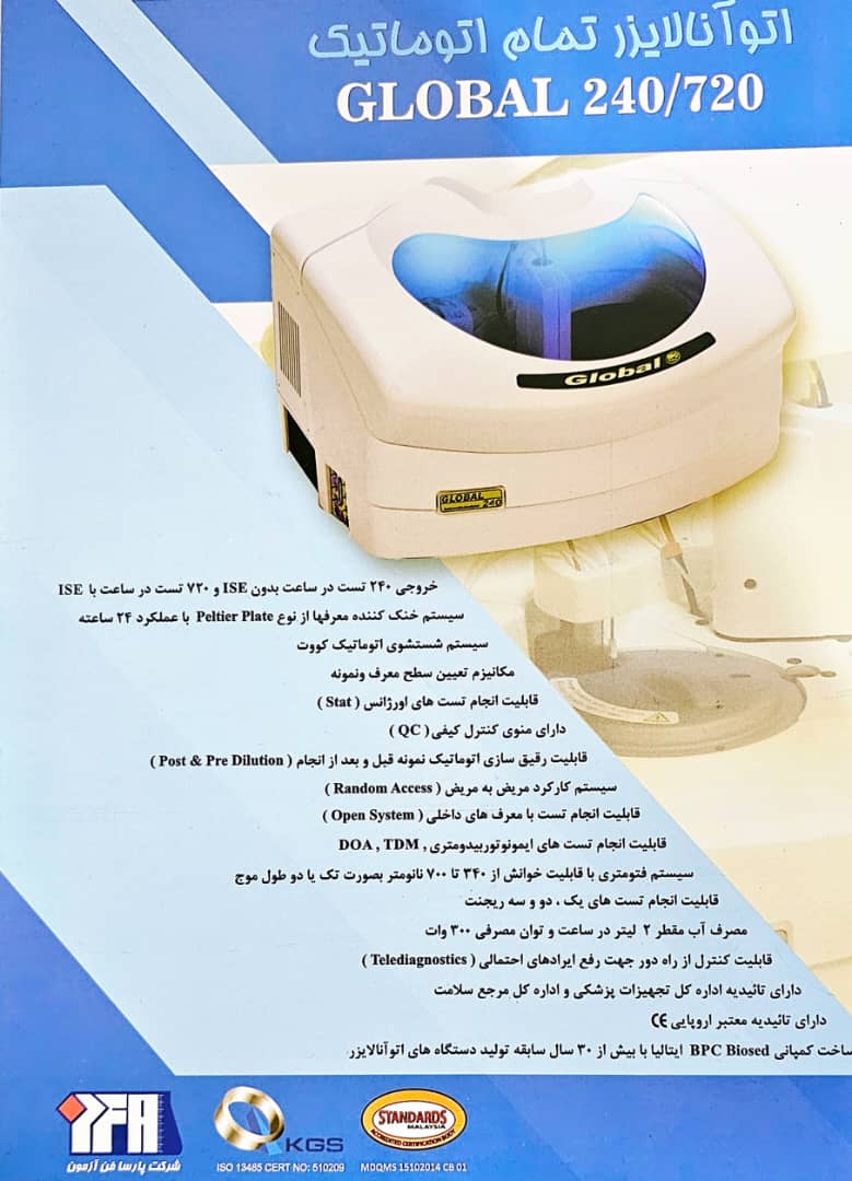 اگر در جستجوی اتوآنالایزر بیوشیمی،اتوآنالایزر رومیزی و یا دستگاه تست بیوشیمی خون با خدمات پس از فروش مطمئن هستید یا قصد ارتقاء تجهیزات آزمایشگاه خود را دارید، اتوآنالایزر Global 240/720 گزینهای اقتصادی و قدرتمند است که میتواند تمام نیازهای شما را پاسخ دهد. در صورت استعلام قیمت تجهیزات آزمایشگاهی و یا قیمت دستگاه الکترولیت آنالایزر کافیست با شماره های 66381035/66381023 و یا شماره 09121340703 تماس حاصل فرمایید.