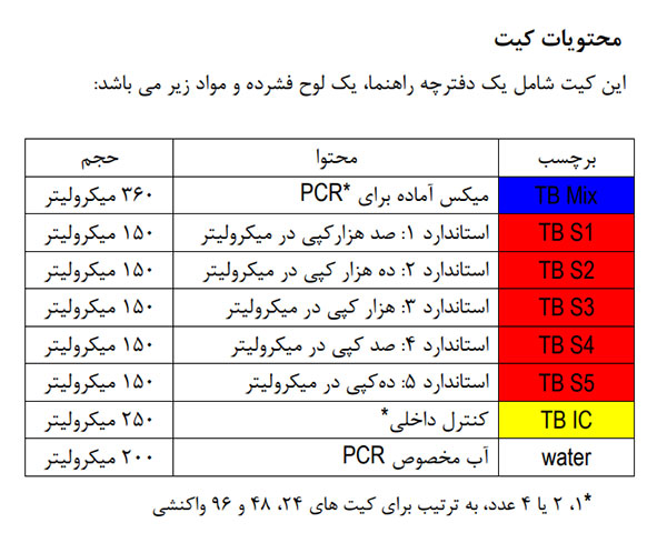 کیت TB RQ برای تشخیص و کمیت سنجی DNA باکتری های گروه مایكوباکتریوم توبرکولوزیس کمپلكس می باشد. این کیت برای کار با دستگاه های Rotor-Gene و StepOne طراحی شده و مخصوص مصارف تحقیقاتی است. این کیت همچنین حاوی کنترل داخلی می باشد که از گزارش منفی کاذب حاصل از ناکارآمدی استخراج DNA و مهار PCR پیشگیری می کند.