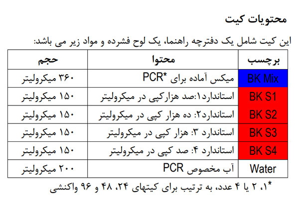 کیت BK RQ برای تشخیص و کمیت سنجی DNA ویروس BK در نمونه پلاسما یا ادرار می باشد. این کیت برای کار با دستگاه های Rotor-Gene و StepOne طراحی شده و مخصوص مصارف تحقیقاتی است. این کیت همچنین حاوی کنترل داخلی می باشد که از گزارش منفی کاذب حاصل از مهار PCR پیشگیری می کند.