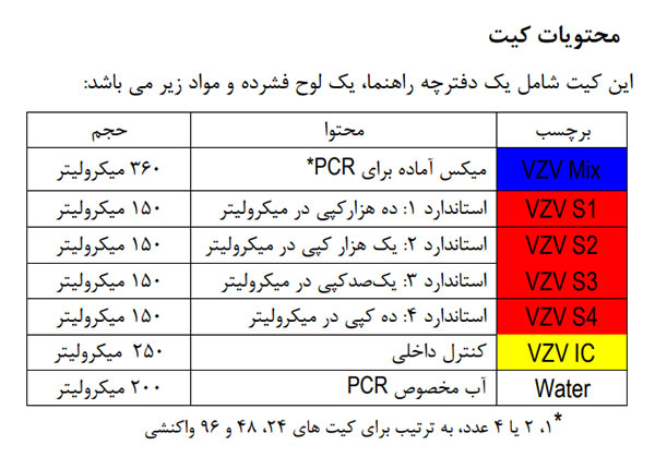 کیت VZV RQ جهت کار با دستگاه های Rotor-Gene و StepOne طراحی شده و به منظور تشخیص و کمیت سنجی DNA ویروس واریسلا زوستر ( Varicella Zoster Virus, VZV ) در نمونه می باشد. این کیت جهت مصارف تحقیقاتی است. این کیت همچنین حاوی کنترل داخلی می باشد که از گزارش منفی کاذب حاصل از استخراج نامناسب نمونه و یا مهار PCR پیشگیری میکند.