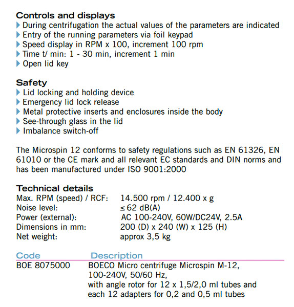 The Microspin 12 conforms to safety regulations such as EN 61326, EN 61010 or the CE mark and all relevant EC standards and DIN norms and has been manufactured under ISO 9001:2000