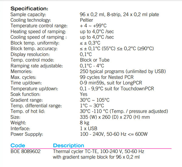 Is a personal Thermal Cycler with compact structure and small footprint and a friendly user interface with colored 5,7’ touch screen and a fixed gradient block for 96 x 0,2 ml which gives reliable results for teaching and research laboratories