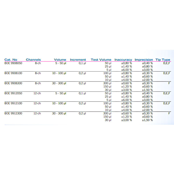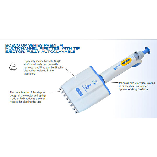 Our premium BOECO GP Series single- and multichannel air-interface adjustable Micropipettes include all features requested by the user: Robustness, simple operation, complete autoclavability and ergonomic design as well as highest accuracy and easy calibration for long lasting reliability