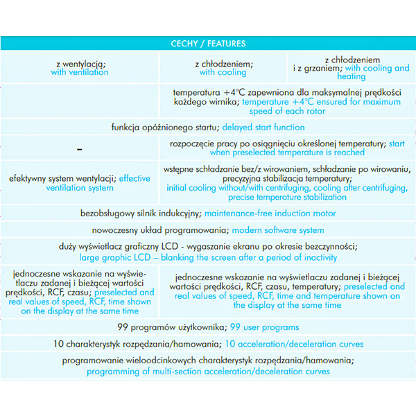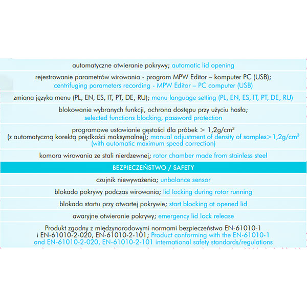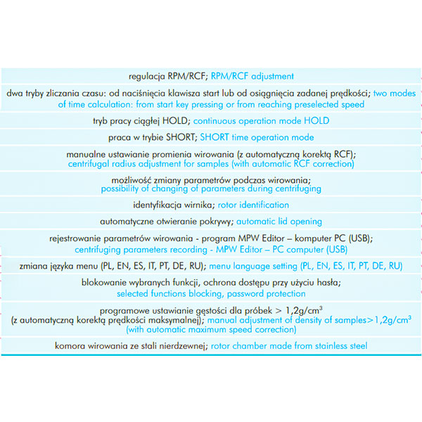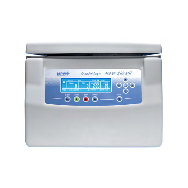 The ventilated centrifuge MPW-260, the refrigerated centrifuge MPW-260R, and the refrigerated and heated centrifuge MPW-260RH belong to a range of universal, tabletop laboratory devices of medium capacity. They are widely used in medical, scientific, industrial, biochemical, veterinary and other laboratories. Owing to the wide selection of available rotors, the centrifuges are highly versatile and offer a high precision of centrifugation, while maintaining relatively compact dimensions
